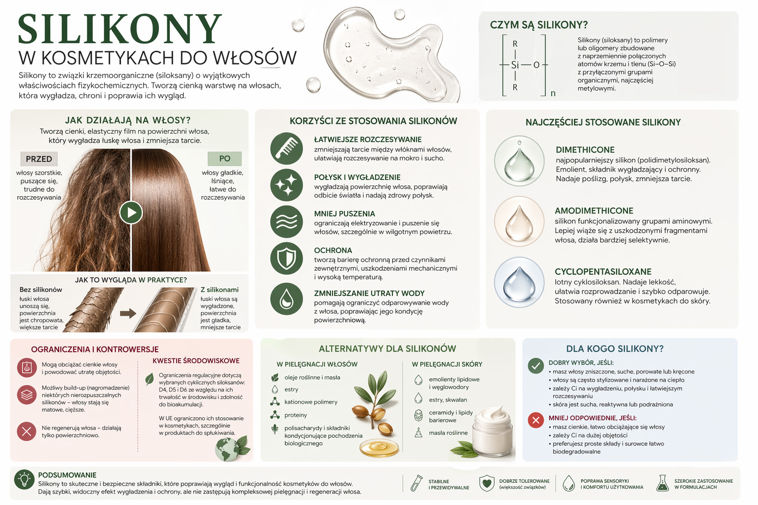 Jednocześnie, obecność silikonów w kosmetykach od lat pozostaje przedmiotem dyskusji wśród konsumentów i specjalistów. Wątpliwości dotyczą zarówno ich wpływu na kondycję włosów i skóry, jak i potencjalnych konsekwencji środowiskowych związanych z niektórymi związkami z tej grupy. W praktyce kosmetologicznej ocena ich roli wymaga uwzględnienia zarówno budowy chemicznej i właściwości fizykochemicznych tych substancji, jak i ich funkcji w konkretnych formulacjach kosmetycznych.